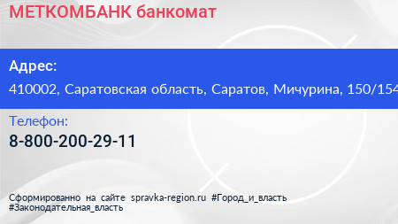 МЕТКОМБАНК, банкомат по адресу 410002, Саратовская область, Саратов, Мичурина, 150/154 в дальнейшем Организация, размещена в следующих категориях: