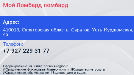 Мой Ломбард, ломбард по адресу 410018, Саратовская область, Саратов, Усть-Курдюмская, 4а в дальнейшем Организация, размещена в следующих категориях: