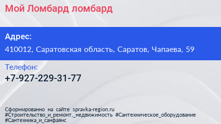 Мой Ломбард, ломбард по адресу 410012, Саратовская область, Саратов, Чапаева, 59 в дальнейшем Организация, размещена в следующих категориях: