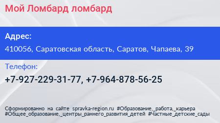 Мой Ломбард, ломбард по адресу 410056, Саратовская область, Саратов, Чапаева, 39 в дальнейшем Организация, размещена в следующих категориях: