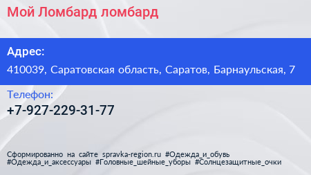 Мой Ломбард, ломбард по адресу 410039, Саратовская область, Саратов, Барнаульская, 7 в дальнейшем Организация, размещена в следующих категориях: