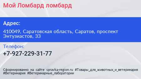 Мой Ломбард, ломбард по адресу 410049, Саратовская область, Саратов, проспект Энтузиастов, 33 в дальнейшем Организация, размещена в следующих категориях: