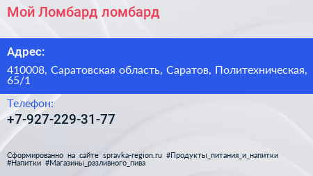 Мой Ломбард, ломбард по адресу 410008, Саратовская область, Саратов, Политехническая, 65/1 в дальнейшем Организация, размещена в следующих категориях: