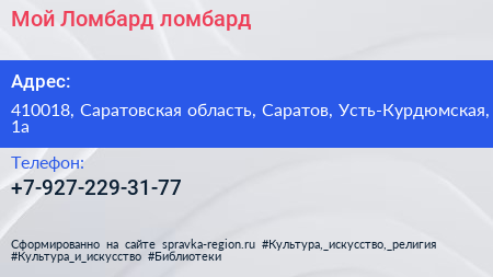 Мой Ломбард, ломбард по адресу 410018, Саратовская область, Саратов, Усть-Курдюмская, 1а в дальнейшем Организация, размещена в следующих категориях: