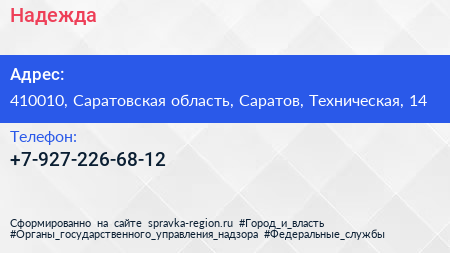 Надежда по адресу 410010, Саратовская область, Саратов, Техническая, 14 в дальнейшем Организация, размещена в следующих категориях: