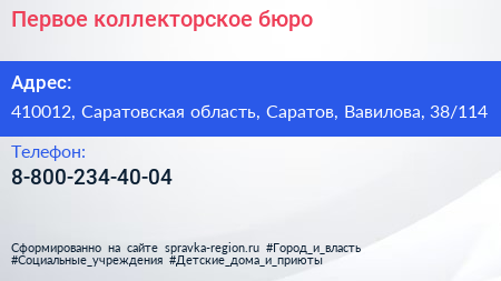 Первое коллекторское бюро по адресу 410012, Саратовская область, Саратов, Вавилова, 38/114 в дальнейшем Организация, размещена в следующих категориях: