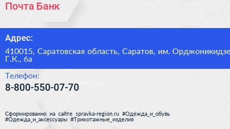 Почта Банк по адресу 410015, Саратовская область, Саратов, им. Орджоникидзе Г.К., 6а в дальнейшем Организация, размещена в следующих категориях: