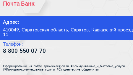 Почта Банк по адресу 410049, Саратовская область, Саратов, Кавказский проезд, 11 в дальнейшем Организация, размещена в следующих категориях:
