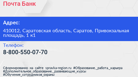 Почта Банк по адресу 410012, Саратовская область, Саратов, Привокзальная площадь, 1 к1 в дальнейшем Организация, размещена в следующих категориях: