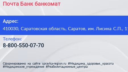 Почта Банк, банкомат по адресу 410030, Саратовская область, Саратов, им. Лисина С.П., 11 в дальнейшем Организация, размещена в следующих категориях: