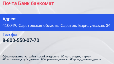 Почта Банк, банкомат по адресу 410049, Саратовская область, Саратов, Барнаульская, 34 в дальнейшем Организация, размещена в следующих категориях:
