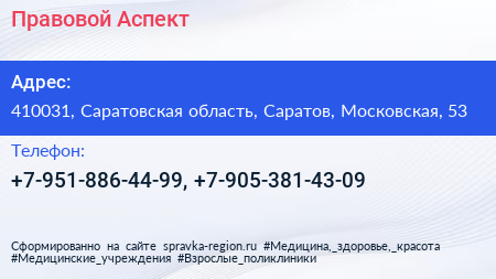 Правовой Аспект по адресу 410031, Саратовская область, Саратов, Московская, 53 в дальнейшем Организация, размещена в следующих категориях: