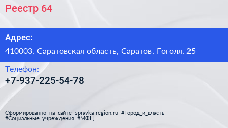 Реестр-64 по адресу 410003, Саратовская область, Саратов, Гоголя, 25 в дальнейшем Организация, размещена в следующих категориях: