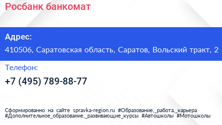 Росбанк, банкомат по адресу 410506, Саратовская область, Саратов, Вольский тракт, 2 в дальнейшем Организация, размещена в следующих категориях: