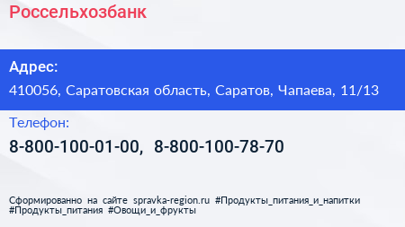 Россельхозбанк по адресу 410056, Саратовская область, Саратов, Чапаева, 11/13 в дальнейшем Организация, размещена в следующих категориях: