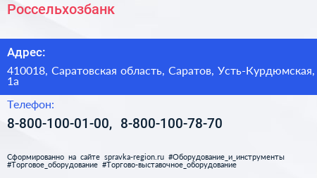 Россельхозбанк по адресу 410018, Саратовская область, Саратов, Усть-Курдюмская, 1а в дальнейшем Организация, размещена в следующих категориях:
