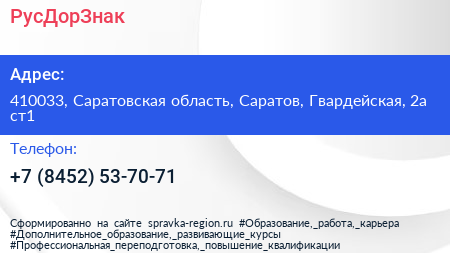 РусДорЗнак по адресу 410033, Саратовская область, Саратов, Гвардейская, 2а ст1 в дальнейшем Организация, размещена в следующих категориях: