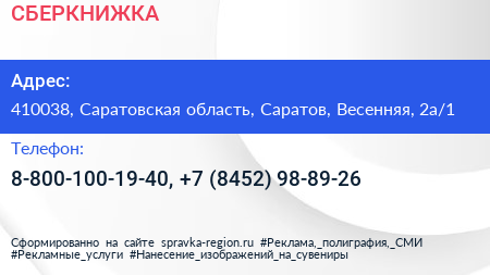 СБЕРКНИЖКА по адресу 410038, Саратовская область, Саратов, Весенняя, 2а/1 в дальнейшем Организация, размещена в следующих категориях: