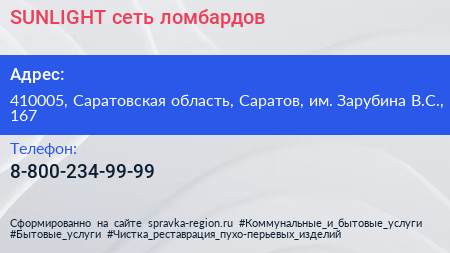 SUNLIGHT, сеть ломбардов по адресу 410005, Саратовская область, Саратов, им. Зарубина В.С., 167 в дальнейшем Организация, размещена в следующих категориях: