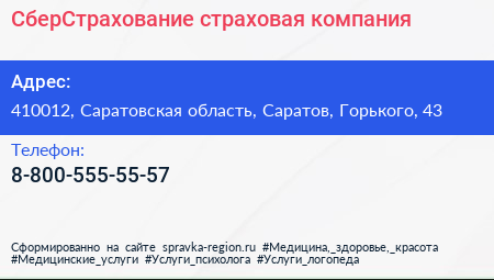 СберСтрахование, страховая компания по адресу 410012, Саратовская область, Саратов, Горького, 43 в дальнейшем Организация, размещена в следующих категориях: