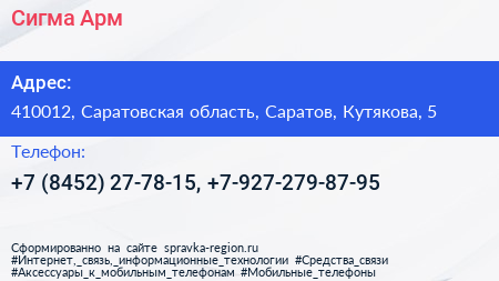 Сигма-Арм по адресу 410012, Саратовская область, Саратов, Кутякова, 5 в дальнейшем Организация, размещена в следующих категориях: