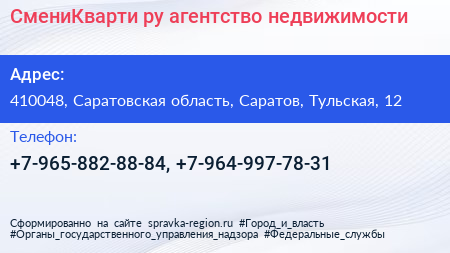 СмениКварти.ру, агентство недвижимости по адресу 410048, Саратовская область, Саратов, Тульская, 12 в дальнейшем Организация, размещена в следующих категориях: