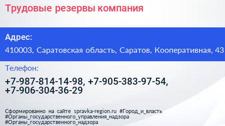 Трудовые резервы, компания по адресу 410003, Саратовская область, Саратов, Кооперативная, 43 в дальнейшем Организация, размещена в следующих категориях:
