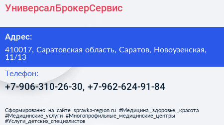 УниверсалБрокерСервис по адресу 410017, Саратовская область, Саратов, Новоузенская, 11/13 в дальнейшем Организация, размещена в следующих категориях: