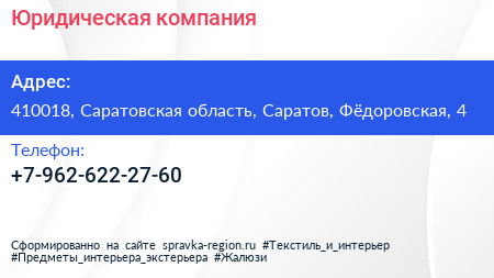 Юридическая компания по адресу 410018, Саратовская область, Саратов, Фёдоровская, 4 в дальнейшем Организация, размещена в следующих категориях: