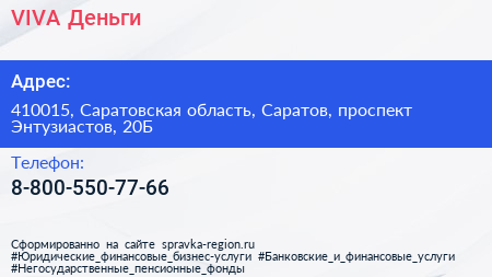 VIVA Деньги по адресу 410015, Саратовская область, Саратов, проспект Энтузиастов, 20Б в дальнейшем Организация, размещена в следующих категориях: