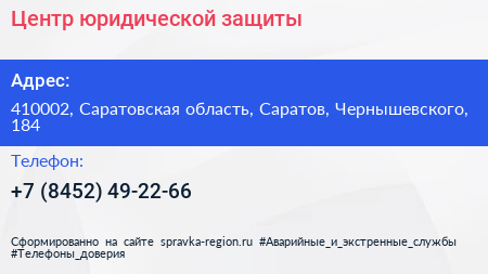 Центр юридической защиты по адресу 410002, Саратовская область, Саратов, Чернышевского, 184 в дальнейшем Организация, размещена в следующих категориях: