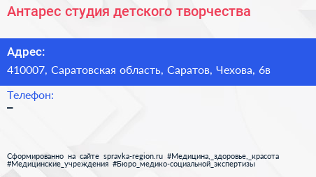 Антарес, студия детского творчества по адресу 410007, Саратовская область, Саратов, Чехова, 6в в дальнейшем Организация, размещена в следующих категориях: