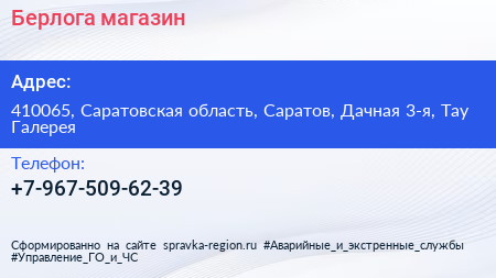 Берлога, магазин по адресу 410065, Саратовская область, Саратов, Дачная 3-я, Тау Галерея в дальнейшем Организация, размещена в следующих категориях:
