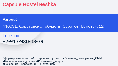 Capsule Hostel Reshka по адресу 410031, Саратовская область, Саратов, Валовая, 12 в дальнейшем Организация, размещена в следующих категориях:
