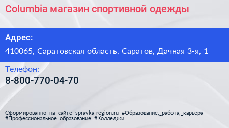 Columbia, магазин спортивной одежды по адресу 410065, Саратовская область, Саратов, Дачная 3-я, 1 в дальнейшем Организация, размещена в следующих категориях:
