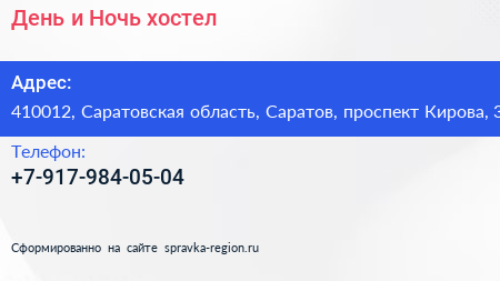 День и Ночь, хостел по адресу 410012, Саратовская область, Саратов, проспект Кирова, 3 в дальнейшем Организация, размещена в следующих категориях: