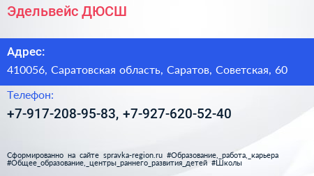 Эдельвейс, ДЮСШ по адресу 410056, Саратовская область, Саратов, Советская, 60 в дальнейшем Организация, размещена в следующих категориях: