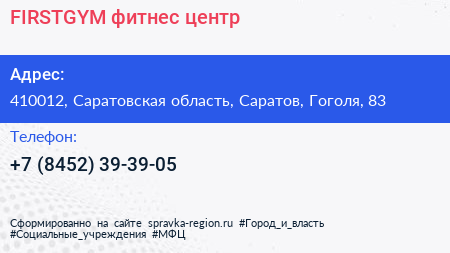 FIRSTGYM, фитнес-центр по адресу 410012, Саратовская область, Саратов, Гоголя, 83 в дальнейшем Организация, размещена в следующих категориях: