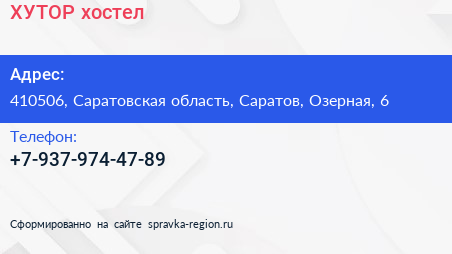 ХУТОР, хостел по адресу 410506, Саратовская область, Саратов, Озерная, 6 в дальнейшем Организация, размещена в следующих категориях: