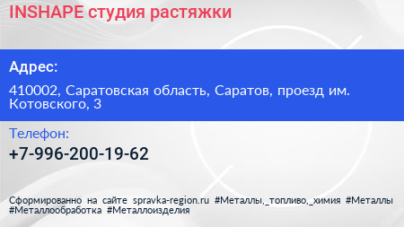 INSHAPE, студия растяжки по адресу 410002, Саратовская область, Саратов, проезд им. Котовского, 3 в дальнейшем Организация, размещена в следующих категориях: