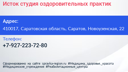 Исток, студия оздоровительных практик по адресу 410017, Саратовская область, Саратов, Новоузенская, 22 в дальнейшем Организация, размещена в следующих категориях: