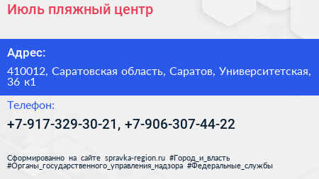 Июль, пляжный центр по адресу 410012, Саратовская область, Саратов, Университетская, 36 к1 в дальнейшем Организация, размещена в следующих категориях:
