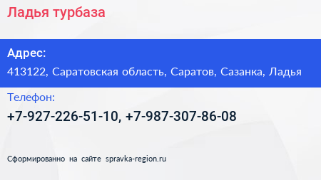 Ладья, турбаза по адресу 413122, Саратовская область, Саратов, Сазанка, Ладья в дальнейшем Организация, размещена в следующих категориях: