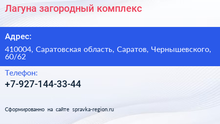 Лагуна, загородный комплекс по адресу 410004, Саратовская область, Саратов, Чернышевского, 60/62 в дальнейшем Организация, размещена в следующих категориях: