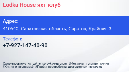 Lodka House, яхт-клуб по адресу 410540, Саратовская область, Саратов, Крайняя, 3 в дальнейшем Организация, размещена в следующих категориях: