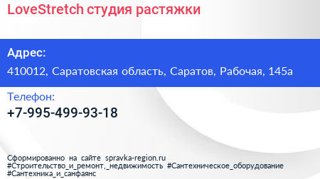 LoveStretch, студия растяжки по адресу 410012, Саратовская область, Саратов, Рабочая, 145а в дальнейшем Организация, размещена в следующих категориях: