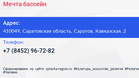 Мечта, бассейн по адресу 410049, Саратовская область, Саратов, Кавказская, 2 в дальнейшем Организация, размещена в следующих категориях: