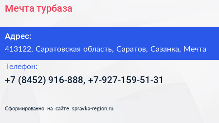 Мечта, турбаза по адресу 413122, Саратовская область, Саратов, Сазанка, Мечта в дальнейшем Организация, размещена в следующих категориях: