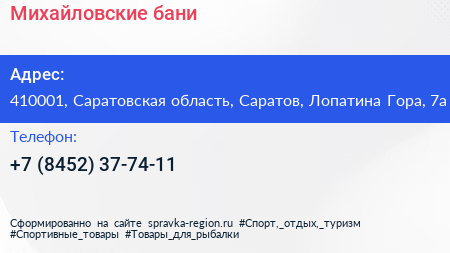 Михайловские бани по адресу 410001, Саратовская область, Саратов, Лопатина Гора, 7а в дальнейшем Организация, размещена в следующих категориях: