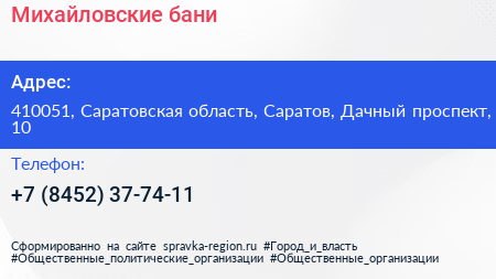 Михайловские бани по адресу 410051, Саратовская область, Саратов, Дачный проспект, 10 в дальнейшем Организация, размещена в следующих категориях: